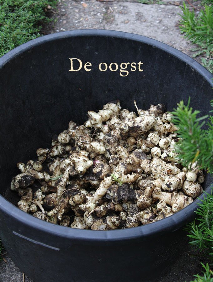Ik wilde de aardpeer wat snoeien. Het snoeien van de bovenkant was zo gepiept, maar ik kon mijn ogen niet geloven wat ik onder een zo’n plantje voor knollen vandaan haalde. Daar is mijn aardappeloogst niets bij. Grote knollen aardpeer haalde ik uit de grond. Zoveel dat ik een speciekuip gevuld kreeg met nogmaar een zijde van wat ik aanplantte eerder dit jaar.