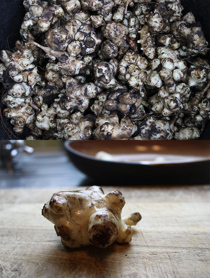 - Smelt de boter in de pan, en fruit daarin de aardpeer, ui en knoflook voor 3 minuten.