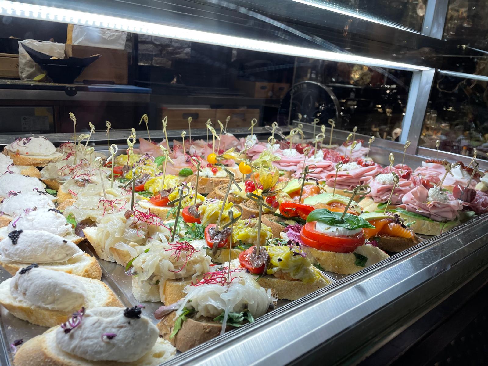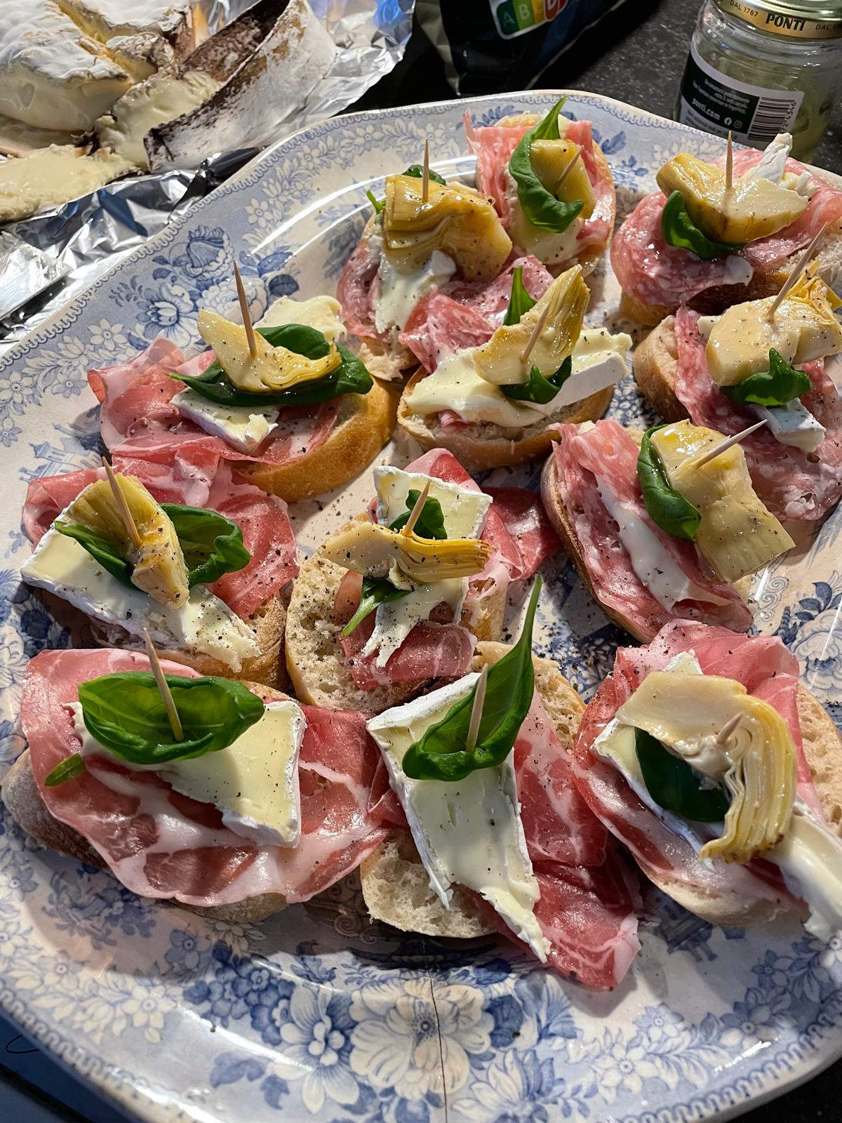 Toen we in de kerstvakantie in Venetië waren zagen we veel kleine gezellige barretjes die kleine hapjes aanboden in combinatie met een glas wijn, spritz of bier. Deze hapjes worden ook wel ‘cicchetti’ genoemd en je heb je in vele combinaties. Het makkelijke van deze hapjes is dat je ze van tevoren kunt klaarmaken. Het staat erg feestelijk en ze zijn natuurlijk erg lekker en je kunt variëren naar hartelust! Ik maakte dit hapjes met ciabatta, Italiaanse vleeswaren zoals salami, coppa en gedroogde ham, brie, een blaadje basilicum en eindigde met artisjok.
