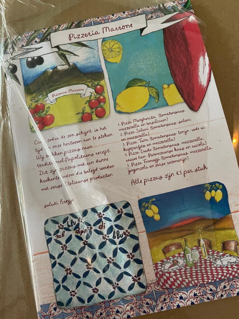 Deze flyer tekende mijn zus Bregje zelf, ze had zelf het idee bedacht van de tegels. Ze stuurde van alle tekeningen een scan op en liet mij vrij om de vormgeving te doen. Het lettertype wat ik gebruikte heet Limoncello, deze is te koop op Creativemarket. De Pomodoro tomaat gherken je misschien van het winnende tomatenblikje wat we voor Italieplein maakten.