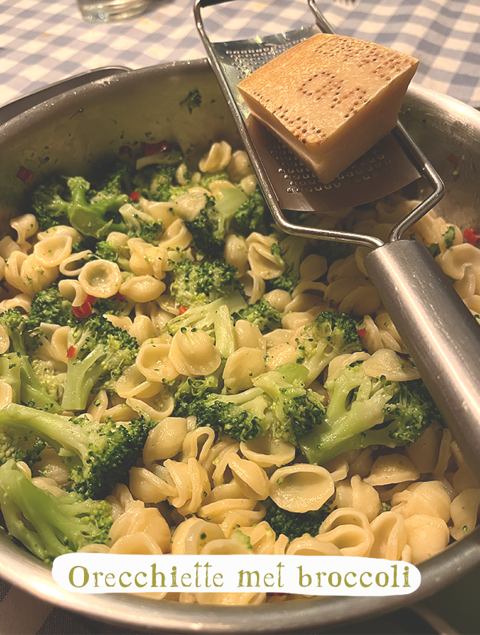 Mijn schoonouders waren op reis, naar Italië. Toen ze na twee maanden weer thuis kwamen hadden ze allemaal souvenirs meegenomen, waaronder een zak echte Italiaanse Orecchiette. Pepijn z’n lievelingspasta, schelpjes! Daarom maakte ik dit kindvriendelijk gerecht (welke ik vond ik in de Italiaanse kookbijbel De Zilveren Lepel p.320, Eerste druk 2012) voor Pepijn! En smullen dat hij deed…